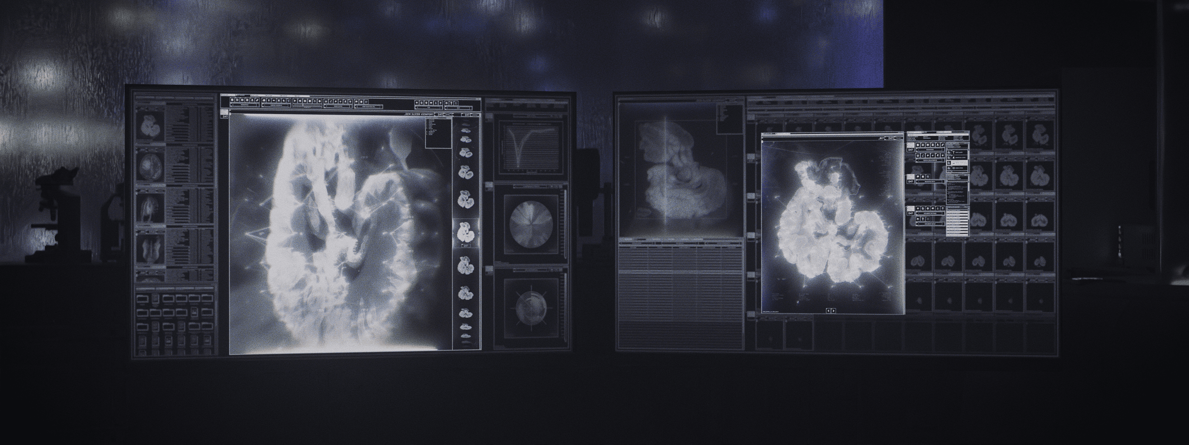 Inspired by the screen graphics in the Blade Runner films, this speculative FUI R&D project explores visualizing volumetric biological scan data. The work focuses on UI systems, interface hierarchy, and motion design for near-future diagnostic interfaces. DICOM (Digital Imaging and Communications in Medicine) files are imported and visualised in Blender using the Bioxel Nodes add-on, allowing 3D rendering of MRI volume data. The interface was designed in Illustrator and composited using After Effects.